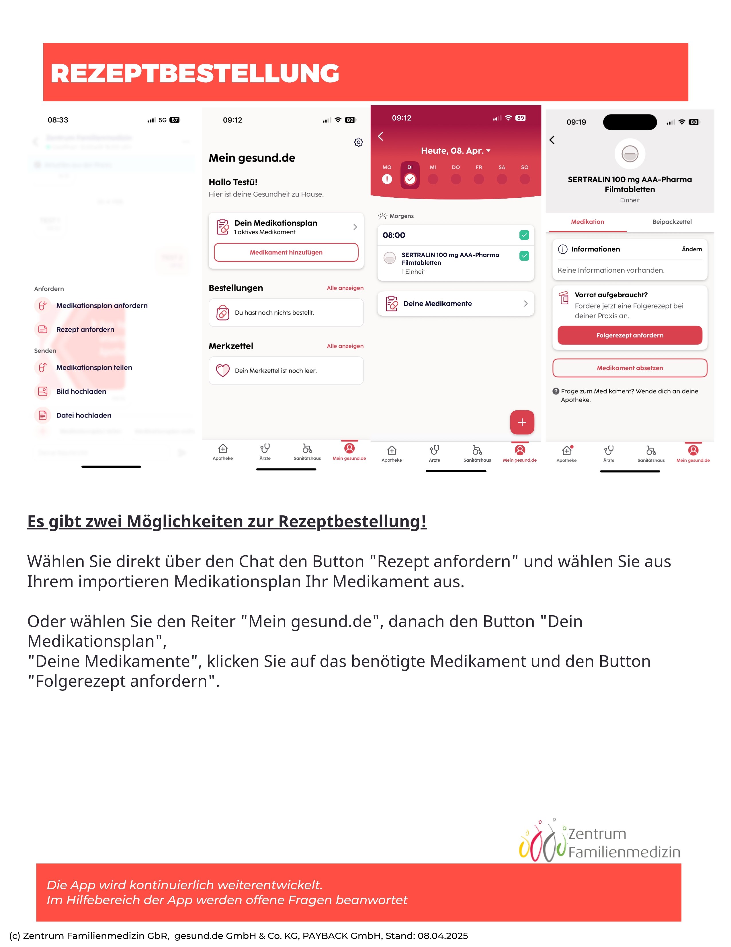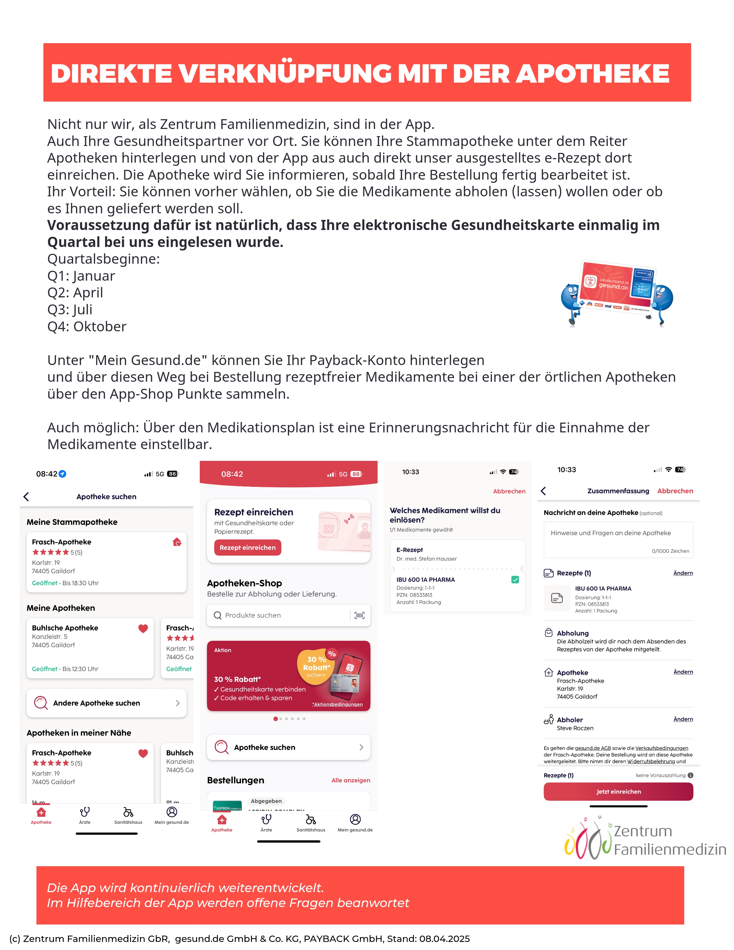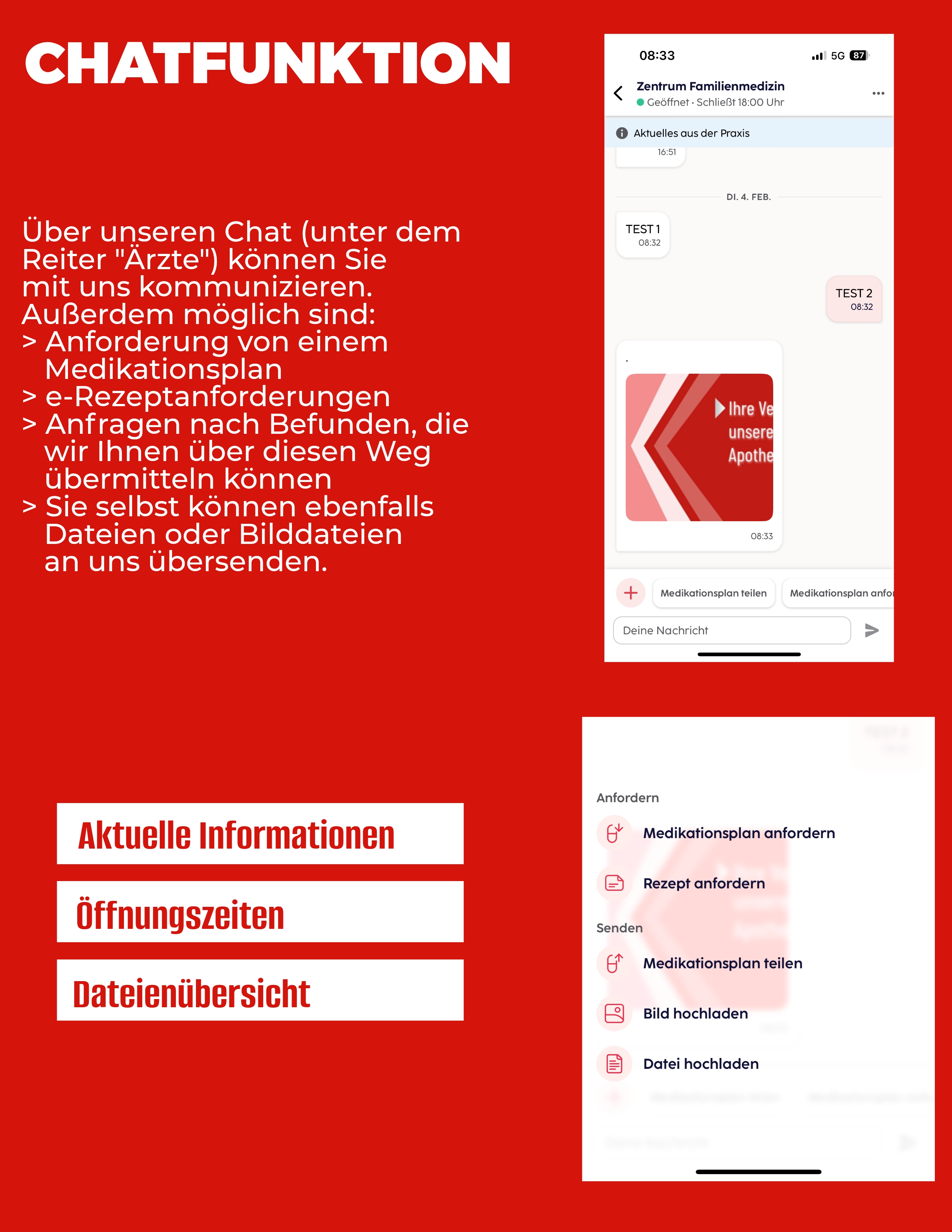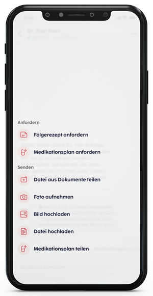 Zudem können Bilder übermittelt werden - durch uns an Sie, oder durch Sie per App via Direktaufnahme mit der Kamera oder aus der Galierie des Smartphones. Das ist zum Beispiel hilfreich bei Befunden und Arztbriefen von Fachärztinnen oder Fachärzten.