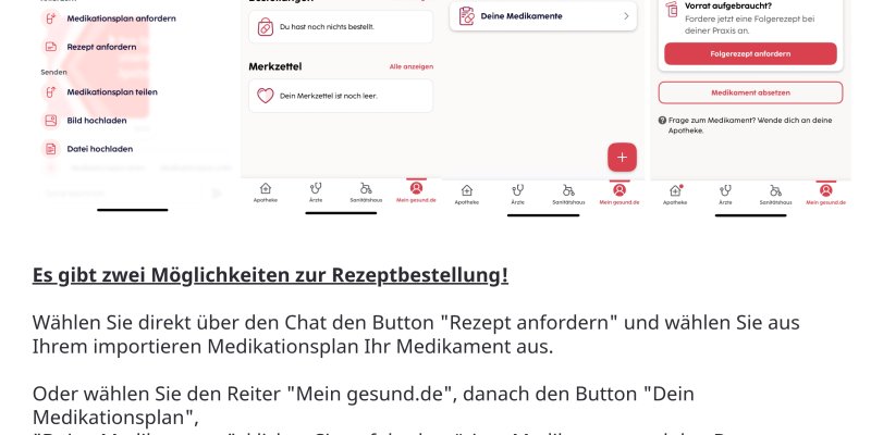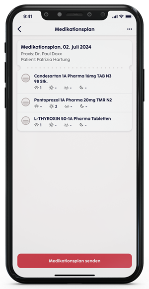 Wir senden Ihnen einen aktuellen Medikationsplan (auf Basis der aktuellen Vorschriften zu Medikationsplänen) zu. Sie können sich an die Einnahme der Medikamente via Push-Benachrichtigung erinnern lassen und in der App eigene Medikamente hinzufügen.