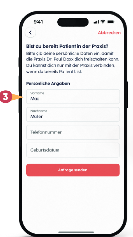 3. Bitte geben Sie die persönlichen Angaben ein, damit wir Sie einfach & sicher als Bestandspatientin oder Patient identifizieren können.